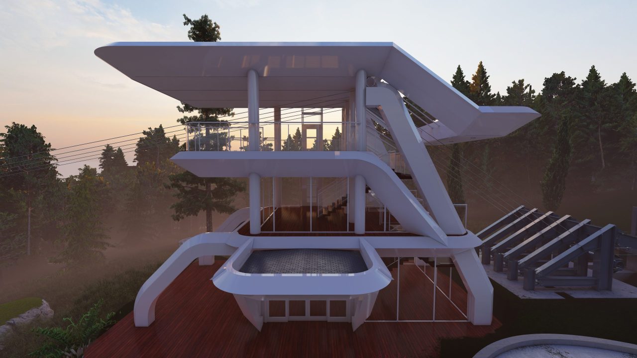 A plataforma de lançamento terá três andares com estruturas de concreto, aço, vidro e madeira. O traçado minimalista e orgânico mantém conexão visual com a natureza circundante. A plataforma de chegada preserva a linguagem arquitetônica curva e envidraçada para contemplação paisagística.